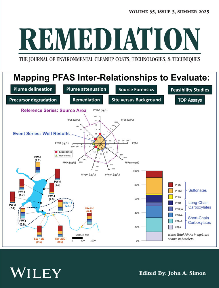 DiGuiseppi, W.H., C.J. Newell, G.R. Carey, P.R. Kulkarni, Z. Xia, J. Stults, T.L. Maher, E.F. Houtz, R. Mora, R. Wice, P.W. Tomiczek, S.D. Richardson, J. Xiong, J. Hale, J.P. Hnatko, R. McGregor, J.T. McDonough, A. Oka, R. Thomas, J. Fenstermacher, J. Hatton, 2024. Available and Emerging Liquid Treatment Technologies for PFAS. Remediation Journal, 34(3): e21782.