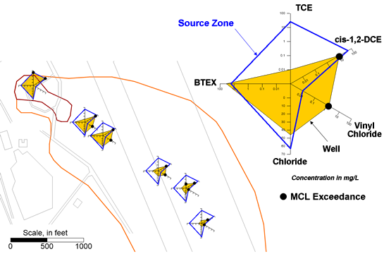 When evaluating the biodegradation of chlorinated solvents, it is important to evaluate concentration trends for the parent species which are degrading, and also for the daughter products which are produced along the flow path. Radial diagrams provide a simple framework for illustrating concentration trends for both the parent species and daughter products on the same figure. This makes it easier to review the inter-related trends than comparing multiple contour figures. Figure 1 shows an example of a VOC radial diagram for the Plattsburgh Air Force Base, New York (Carey et al., 2003). The radial diagram inset shown on Figure 1 presents a VOC radial diagram for one monitoring well which is situated downgradient of the NAPL source zone. A reference data series (blue line) is plotted on the radial diagram inset, to represent source zone concentrations. The other data series (black line with orange fill) represents concentrations for the downgradient monitoring well represented by this radial diagram. The axes for the radial diagrams include total BTEX as an indicator of substrate concentrations, TCE, cis-1,2-DCE and vinyl chloride (which are daughter products of TCE reductive dechlorination), and chloride as a general indicator of biodegradation and groundwater flow path. The radial diagram axes for VOCs on Figure 1 are plotted using a log scale, to facilitate an order-of-magnitude analysis with respect to relative changes in concentrations along the flow path, as well as a qualitative illustration of the relative ratio between parent and daughter product concentrations at each monitoring well. For example, trends which are clearly evident on the radial diagram shown on Figure 1 include: